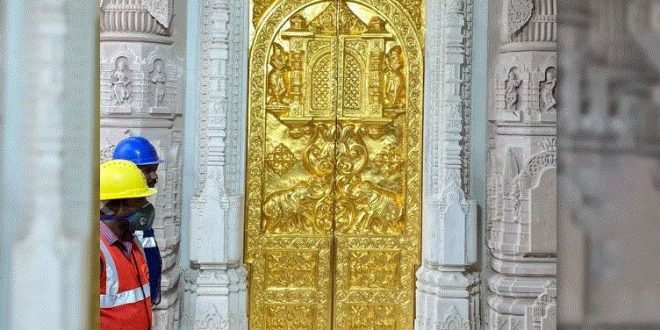 अयोध्या। श्रीराम जन्मभूमि अयोध्या में बने रामलला के भव्य मंदिर में सोने की परत चढे़ गेट लगाए जा रहे हैं। मंगलवार को स्वर्ण जड़ित गेट की पहली तस्वीर सामने आई तो भक्त प्रफुल्लि हो उठे। स्वर्ण जड़ित यह दरवाजा गर्भगृह के मुख्य द्वार पर लगाया गया है। मंदिर में ऐसे 14 दरवाजे लगाए जाने हैं, जिनमें करीब 100 किलो सोना उपयोग होने का अनुमान है।अयोध्या नागर शैली में बनाए जा रहे भव्य राम मंदिर में 392 खंभे और 44 द्वार हैं। पहली मंजिल बनकर तैयार हो गई है। इसके लिए दरवाजे हैदराबाद की एक कंपनी तैयार कर रही है। दरवाजों में शानदार नक्काशी की गई है। इनमें शुभता के प्रतीक माने जाने चिह्नों व संकेतों के अलावा हाथी, घोड़े, कमलदल और झरोखे जैसे डिजाइन बनाई गई हैं।