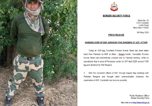 BSF के अनुसार, कांस्टेबल शॉ 23 अप्रैल 2025 को फिरोजपुर सेक्टर में ऑपरेशनल ड्यूटी के दौरान गलती से अंतरराष्ट्रीय सीमा पार कर पाकिस्तान की सीमा में चले गए थे। इसके बाद पाक रेंजर्स ने उन्हें हिरासत में ले लिया था।