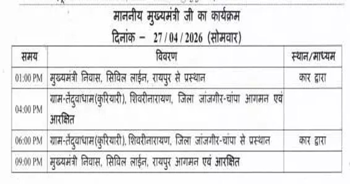 दौरे के दौरान मुख्यमंत्री स्थानीय जनप्रतिनिधियों और आम लोगों से भी मुलाकात कर सकते हैं। कार्यक्रम के बाद वे शाम तक रायपुर लौटने की तैयारी में रहेंगे और रात लगभग 9 बजे मुख्यमंत्री निवास पहुंचने का कार्यक्रम है।