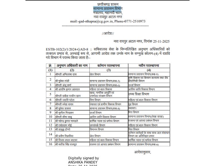 रायपुर। छत्तीसगढ़ में बड़ा प्रशासनिक फेरबदल किया गया है। सामान्य प्रशासन विभाग की ओर से जारी अधिसूचना के अनुसार, राज्य के 16 अधिकारियों का तबादला किया गया है। सचिवालय सेवा के 16 अनुभाग अधिकारियों को तत्काल प्रभाव से अगले आदेश तक अलग अलग पदों पर पदस्थ किया गया है। देखें सूची..