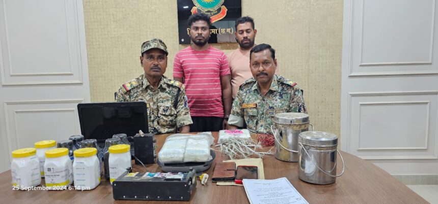 पूछताछ करने पर दोनों ने अपना नाम क्रमशः (1) मंतोष मण्डल (2) एस. नार्गाजून होना बताया गया तथा मेमोरण्डम के आधार संदिग्धों के कब्जे से पृथक-पृथक 2 किग्रा0 यूरिया पाउडर, 2 डिब्बा विस्फोट करने वाला पोटेशियम नाईट्रेट, 3 डिब्बा विस्फोट करने वाला एल्यूमिनियम पाउडर, पैक करने वाला रेपर झिल्ली 2 पैकेट, 1 नग टिफिन बम,2 नग तार युक्त डेटोनेटर एवं 3 नग नक्सल साहित्य जिसे नक्सलियों द्वारा प्रचार-प्रसार हेतु दिये है एवं 2 नग रियल मी कम्पनी का मोबाईल मय सिम एवं 3 डिब्बा विस्फोट करने वाला पोटेशियम नाईट्रेट 2 डिब्बा विस्फोट करने वाला एल्यूमिनियम पाउडर, पैक करने वाला रेपर झिल्ली 3 पैकेट, 1 नग टिफिन बम,8 नग तार युक्त डेटोनेटर एवं 3 नग नक्सल साहित्य 1 नग प्रिटिंग मेक टेक, 1 नग HP कम्पनी का लेपटॉप, 3 नक्सल साहित्य जिसे नक्सलियों द्वारा प्रचार प्रसार हेतु दिये है,एवं एक नग नियल नॉट कंपनी का मोबाईल मय सिम, 1 नग विवो कंपनी का मोबाईल मय सिम बरामद किया गया। उपरोक्त विस्फोटक सामाग्री रखे जाने के संबंध में गहन पूछताछ करने पर दोनों व्यक्तियों द्वारा वर्ष 2020 से PLGA बटालियन नक्सलियों के लिए खाद्य सामाग्री, गन पाउडर, केमिकल, डेटोनेटर, वाकी-टाकी, विस्फोटक सामाग्री इत्यादि सप्लाई करना एवं उक्त सामाग्रियों को नक्सलियों को देने के लिए रखना बताये। उक्त कृत विधि विरूद्ध पाये जाने से थाना सुकमा में अपराध पंजीबद्ध कर अग्रिम वैधानिक कार्यवाही करते हुए दोनों आरोपियों को विधिवत गिरफ्तार कर न्यायालय के समक्ष पेश कर न्यायिक रिमाण्ड पर जेल भेजा गया।