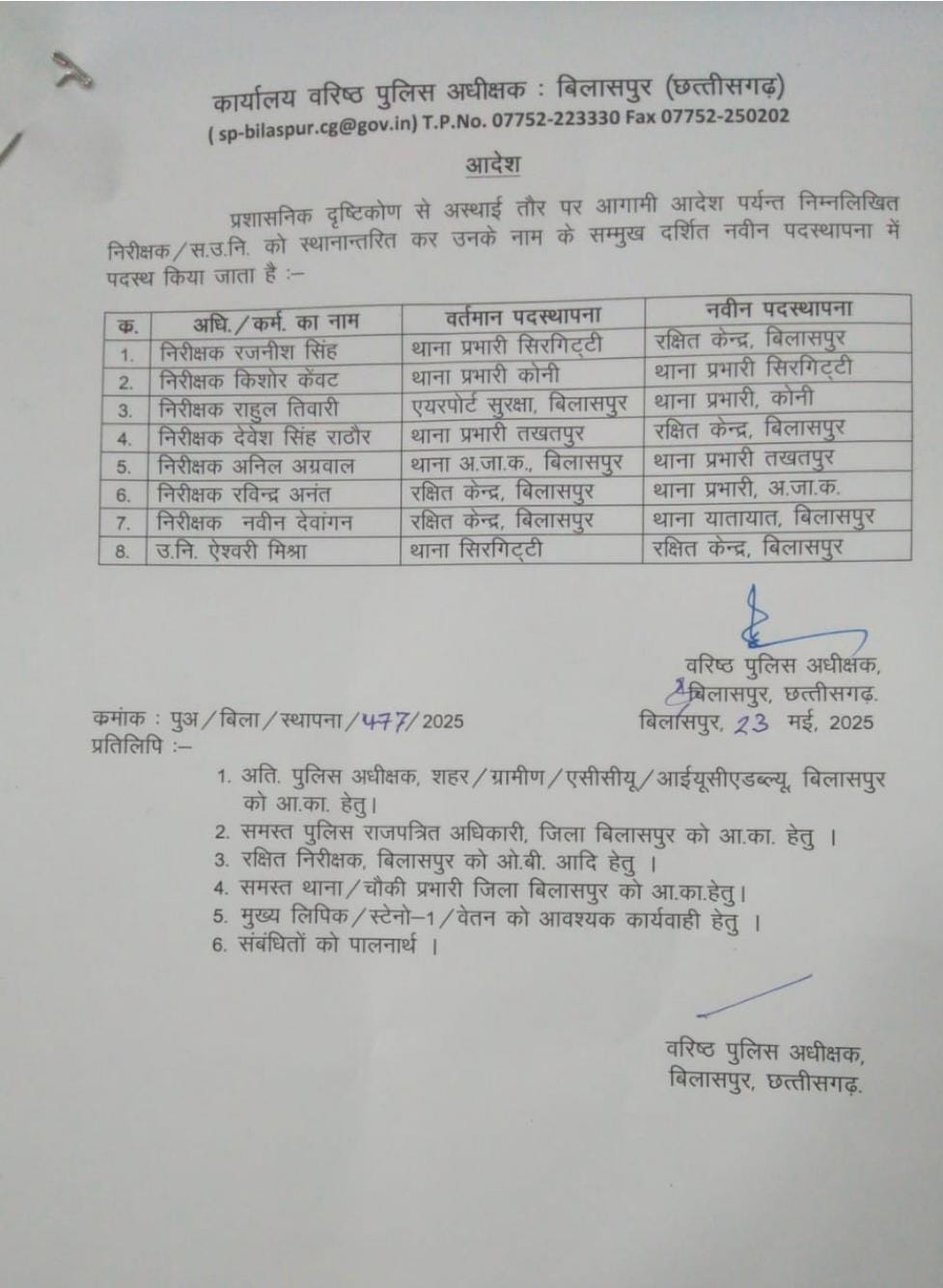बिलासपुर//छत्तीसगढ़ के बिलासपुर जिले में एसएसपी रजनेश सिंह नें प्रशासनिक दृष्टिकोण से 8 थाना प्रभारियो कों बदला हैँ जिसमे कोनी से लेकर सिरगिट्टी शामिल हैँ कुछ थाना के प्रभारियो कों लाइन भी भेजा गया हैँ बिलासपुर पुलिस हर हाल में पब्लिक और पुलिस के बीच एक शानदार समन्वय चाहती हैँ और ऐसे थाना प्रभारियों कों थाना भेज रही हैँ जो बेदाग हैँ जो अपने कर्तब्यो कों ईमानदारी से निभाते हुए ड्यूटी पर रहें यही कारण हैँ की समय समय पर थाना प्रभारियों कों यहाँ से वहां किया जा रहा हैँ।