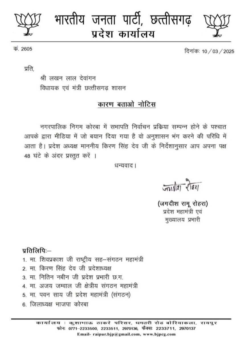 रायपुर। कैबिनेट मंत्री लखन देवांगन को बीजेपी ने कारण बताओ नोटिस भेजा है. लखन देवांगन को जवाब देने के लिए 48 घंटे का समय दिया गया है. कोरबा नगर निगम के नवनिर्वाचित सभापति नूतन सिंह ठाकुर को निष्कासित करने के बाद पार्टी ने यह नोटिस भेजा है. सभापति के चुनाव के बाद लखन देवांगन ने मीडिया को बयान दिया था.