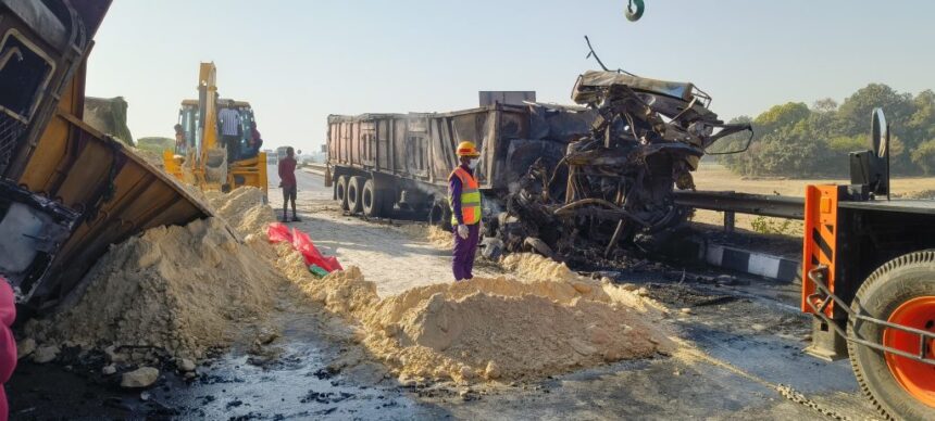 प्राप्त जानकारी के अनुसार, ट्रक में जिप्सम लोड था और उसका टायर फट जाने के कारण चालक और खलासी नीचे उतरे हुए थे। इसी दौरान पीछे से तेज रफ्तार में आ रहे ट्रेलर ने ट्रक को टक्कर मार दी, जिससे दोनों वाहनों में आग लग गई। देखते ही देखते आग इतनी विकराल हो गई कि ट्रेलर चालक बाहर नहीं निकल सका और उसकी मौके पर ही जलकर मौत हो गई।