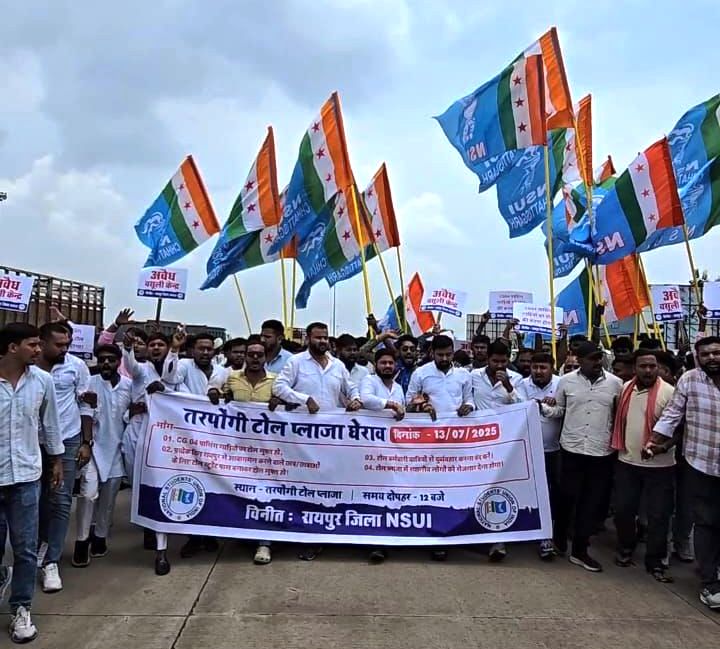 रायपुर। छात्र और युवा हितों को लेकर तरपोंगी टोल प्लाजा पर किए गए शांतिपूर्ण प्रदर्शन के बाद एनएसयूआई के 9 पदाधिकारियों पर एफआईआर दर्ज की गई है। एफआईआर को लेकर एनएसयूआई ने तीखी प्रतिक्रिया दी है और इसे “दबाव की राजनीति” करार दिया है। संगठन ने साफ किया है कि वह छात्रों और युवाओं की लड़ाई से पीछे नहीं हटेगा।