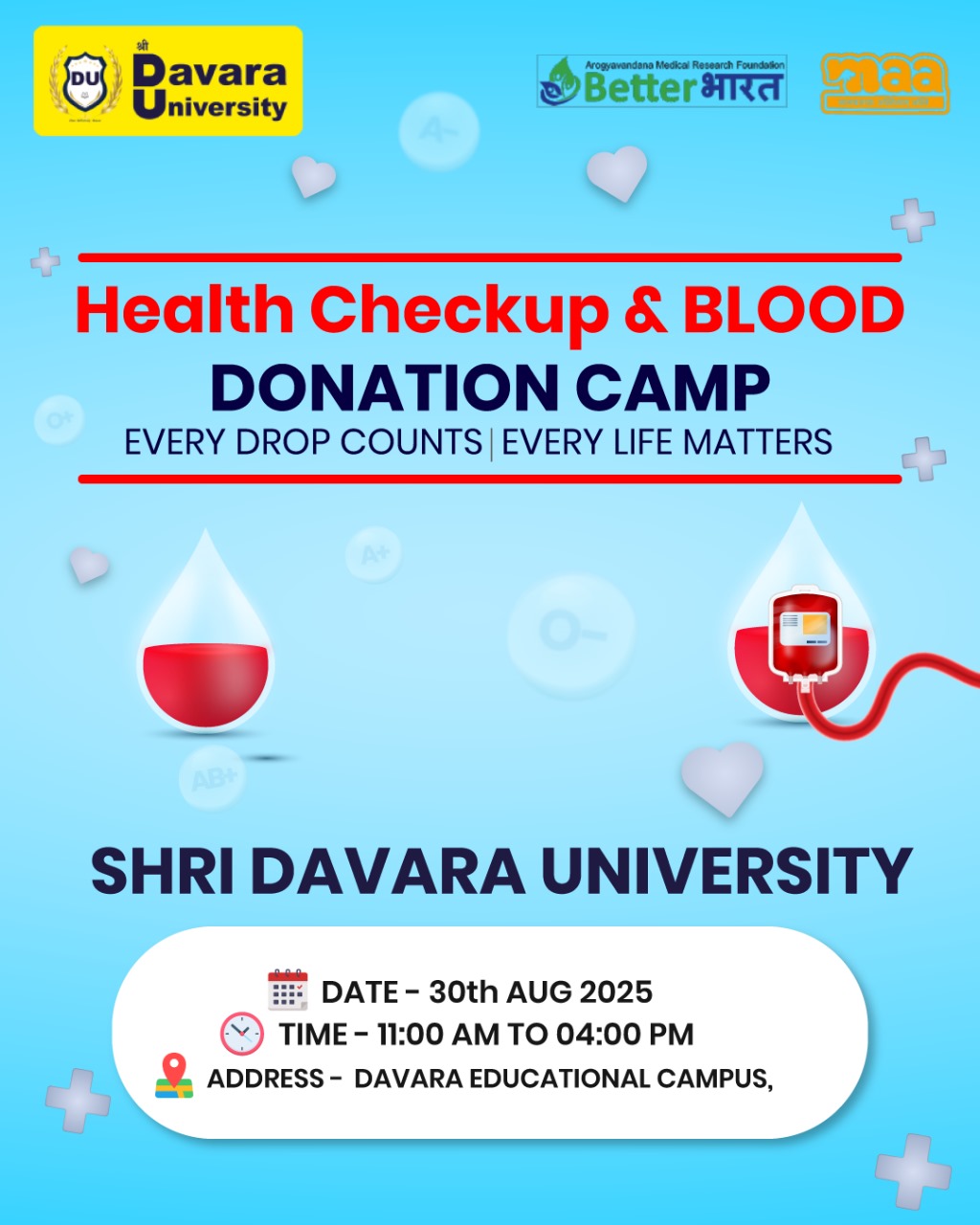 रायपुर, 30 अगस्त 2025 –“बेटर भारत फाउंडेशन” एवं “माँ फाउंडेशन” के संयुक्त तत्वावधान में दावरा विश्वविद्यालय परिसर में एक दिवसीय स्वास्थ्य जांच एवं रक्तदान शिविर का आयोजन किया जा रहा है।