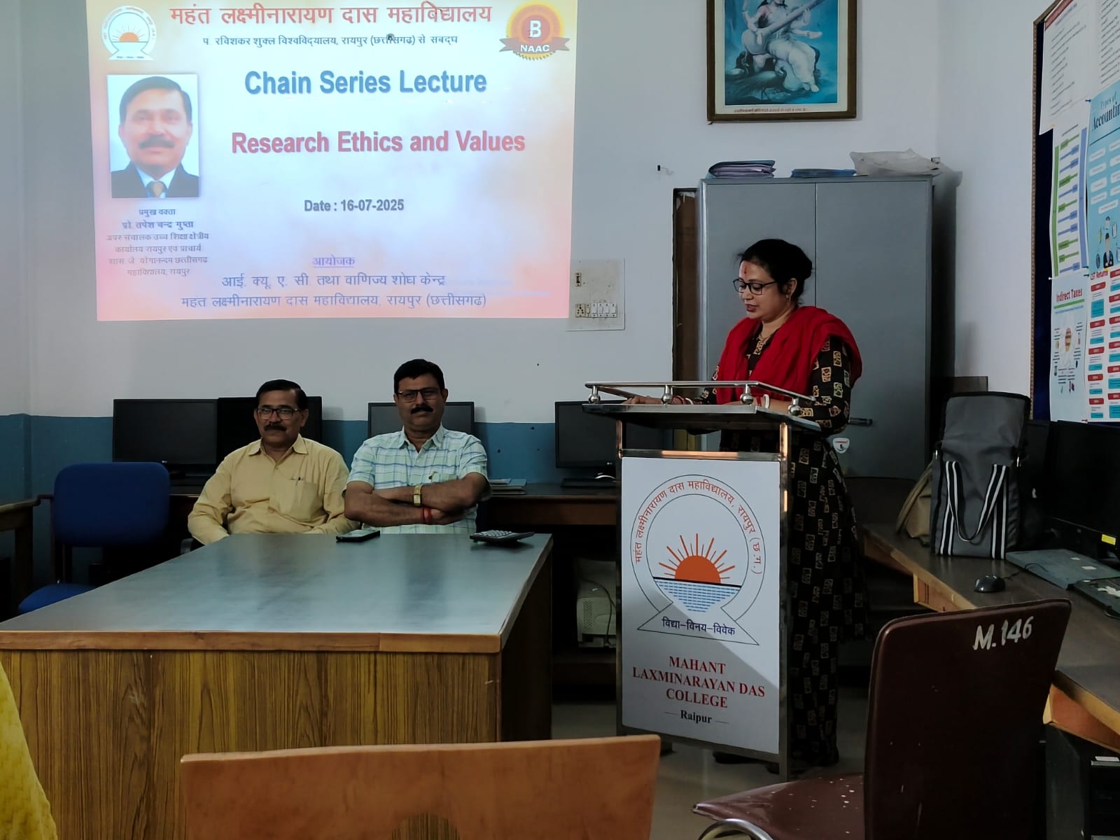 रायपुर :- महंत लक्ष्मी नारायण दास महाविद्यालय में वाणिज्य शोध केंद्र और आई. क्यू. ए. सी. द्वारा रिसर्च एथिक्स एंड वैल्यूज पर व्याख्यान आयोजित किया गया। कार्यक्रम की अध्यक्षता कर रहे प्राचार्य डॉ देवाशीष मुखर्जी ने एथिकल साइंटिफिक मेथड के चरण और रिसर्च एथिक्स एंड वैल्यूज की आवश्यकता पर अपने विचार प्रस्तुत किए। प्रमुख वक्ता डॉ तपेश चंद्र गुप्ता अपर संचालक उच्च शिक्षा क्षेत्रीय कार्यालय एवं प्राचार्य शासकीय जे योगानंदम छत्तीसगढ़ महाविद्यालय रायपुर ने कहा कि एथिक्स, मोरल और वैल्यूज में अंतर होते हुए भी सभी के जीवन में महत्वपूर्ण स्थान है। अपने व्यक्तिगत मूल्य को नैतिकता बनाने का प्रयास नहीं करना चाहिए।शोध से संबंधित किसी भी कार्य को करते समय शोधार्थी को सार्वजनिक नियम, नैतिक मानक, ज्ञान का लोकतंत्रीकरण, नैतिक संचार और भाषा, मानव की स्वतंत्रता पर ध्यान देना होगा। सुझाव देते समय किसी भी समाज, धर्म, जाति या किसी भी पार्टी की निंदा नहीं करनी चाहिए। शोध समस्या, साहित्य समीक्षा, उद्देश्य, परिकल्पना, शोध प्रविधि के सभी पहलुओं पर नैतिकता को विशेष ध्यान में रख कर शोध कार्य करने पर जोर दिया गया। कार्यक्रम का संचालन डॉ श्वेता महाकालकर सहायक प्राध्यापक वाणिज्य संकाय ने किया है।फीडबैक व धन्यवाद ज्ञापन शोधार्थी लोकेश साहू ने दिया। विभागाध्यक्ष डॉ शांतनु पाल और सभी शोधार्थियों की उपस्थिति ने इस कार्यक्रम को सफल बनाया।