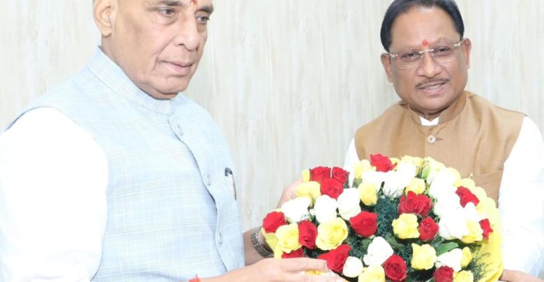 नई दिल्ली। छत्तीसगढ़ के मुख्यमंत्री विष्णुदेव साय ने आज नई दिल्ली में केंद्रीय रक्षा मंत्री राजनाथ सिंह से उनके निवास पर सौजन्य मुलाक़ात की। बैठक में बिलासपुर एयरपोर्ट के विस्तार, रक्षा क्षेत्र के विकास, पूरे प्रदेश में सेना भर्ती रैलियों के आयोजन एवं नौसैनिक पोतों के नामकरण जैसे कई महत्वपूर्ण विषयों पर सार्थक चर्चा हुई। इस अवसर पर केंद्रीय आवासन एवं शहरी कार्य राज्यमंत्री तोखन साहू और मुख्यमंत्री के प्रमुख सचिव सुबोध कुमार सिंह भी उपस्थित थे।