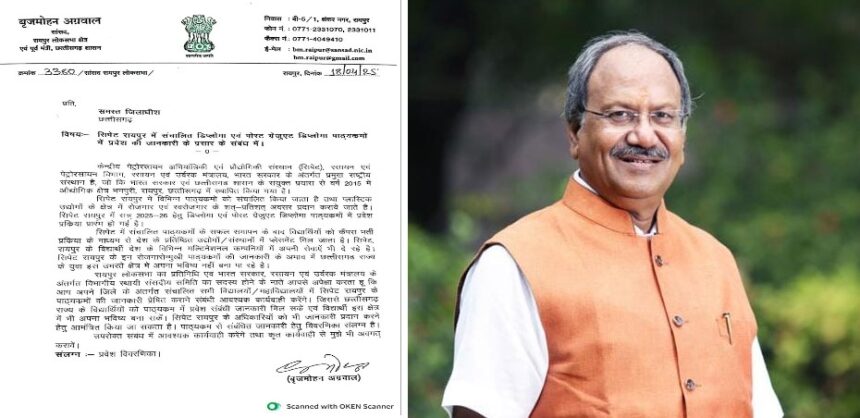 रायपुर :छत्तीसगढ़ के युवाओं के लिए एक उज्जवल भविष्य की दिशा में एक नई पहल की शुरुआत की है रायपुर लोकसभा सांसद श्री बृजमोहन अग्रवाल ने। सांसद ने राज्य के सभी जिला कलेक्टर्स को पत्र लिखकर सिपेट रायपुर (CIPET Raipur) में चल रहे डिप्लोमा और पोस्ट ग्रेजुएट डिप्लोमा पाठ्यक्रमों की जानकारी अधिक से अधिक छात्रों तक पहुँचाने का आग्रह किया है।