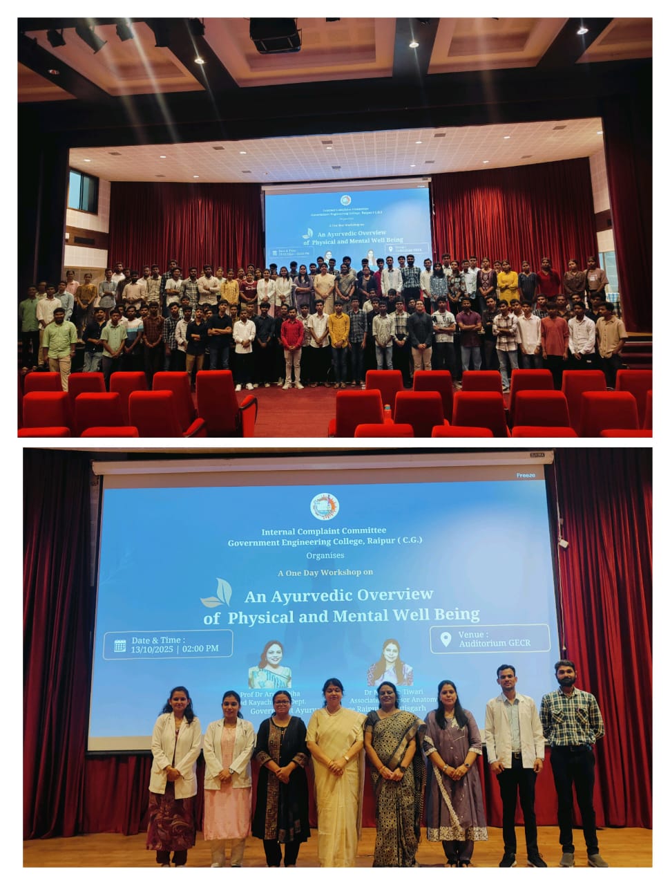 रायपुर :- राज्य के प्रतिष्ठित तकनीकी संस्थान शासकीय अभियांत्रिकी महाविद्यालय, रायपुर में छत्तीसगढ़ राज्य के रजत जयंती वर्ष के सुअवसर पर "एन आयुर्वेदिक ओवरव्यू ऑफ़ फिज़िकल एंड मेंटल वेल-बींग" विषय पर एक दिवसीय कार्यशाला का दिनाँक 13/10/2025 को आंतरिक शिकायत समिति के तत्वावधान में शानदार आयोजन किया गया। कार्यक्रम की शुरुआत माँ सरस्वती के चित्र पर पुष्पांजलि अर्पित कर एवम दीप प्रज्वलित करने से हुई।