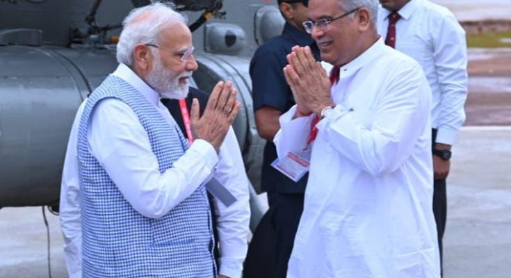 प्रधानमंत्री नरेंद्र मोदी के रायपुर पहुंचने पर हेलीपेड पर मुख्यमंत्री भूपेश बघेल ने किया स्वागत